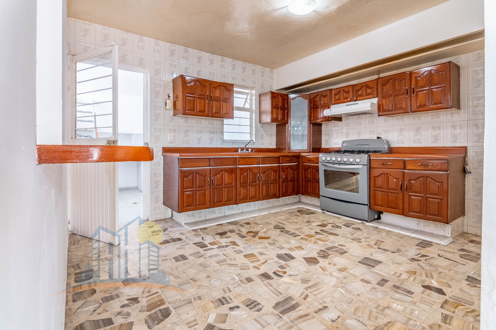 Cocina Integral Equipada con gavetas de Madera, Estufa con campana y barra desayunadora