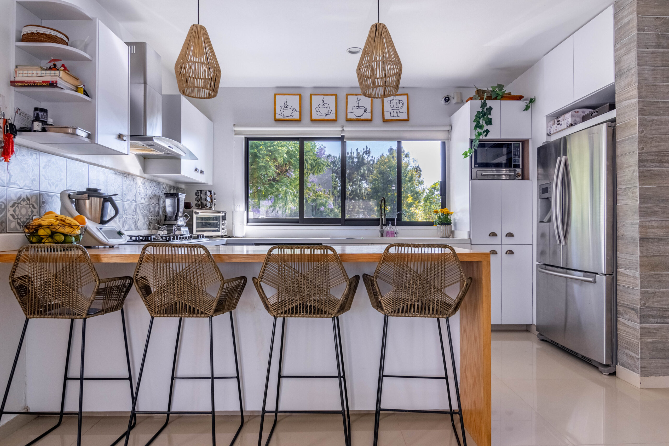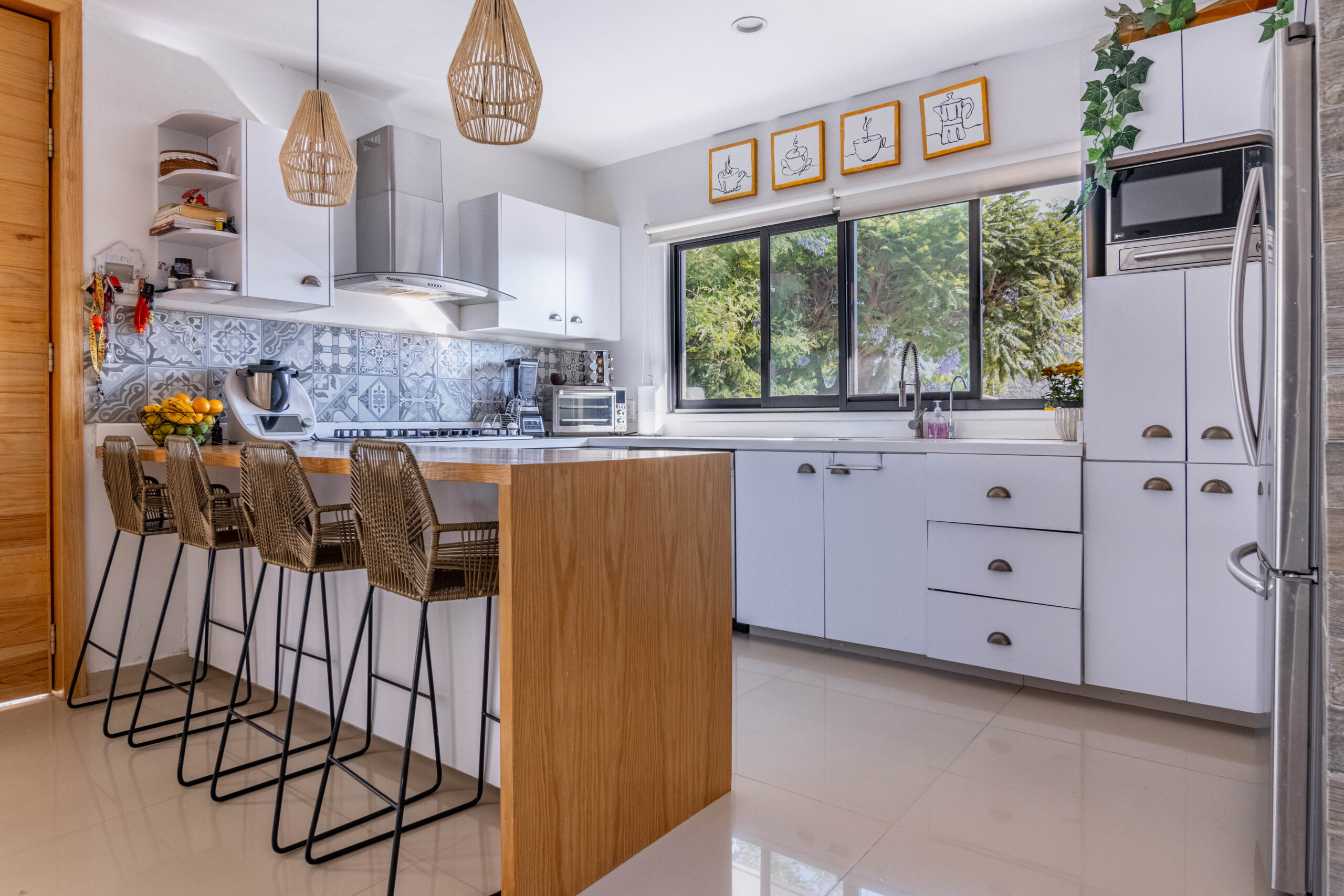 -Cocina integral con lavavajillas integrado y barra desayunadora de madera.